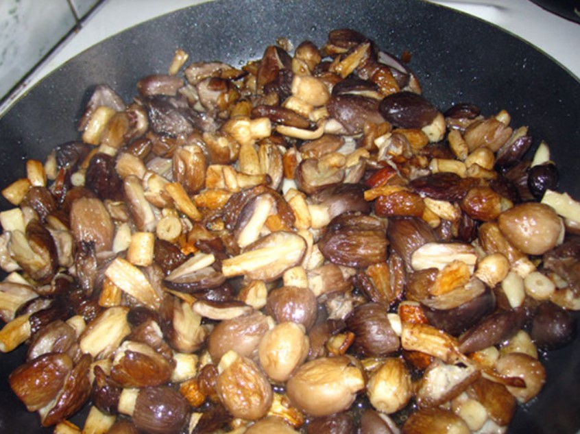 Измийте, почистете и нарежете гъбите на средно големи парчета. Сложете ги в тиган с предварително загрято олио и запържете за 10 минути.