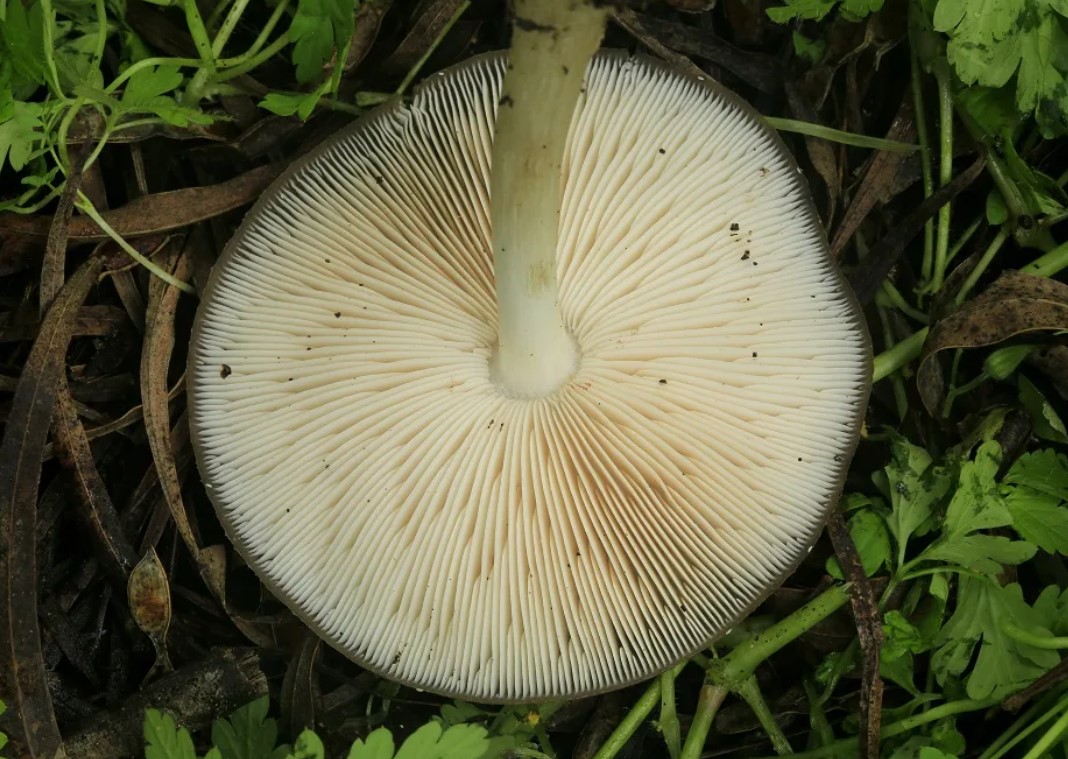 Шапката на бялата гъба плутеус съдържа широки хриле. Първоначално те са бели. С узряването на гъбите и образуването на спори обаче те стават розови.