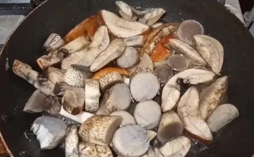 - Гъбите се нарязват на парчета, слагат се в тенджера, варят се 10 минути и се отцеждат в гевгир.