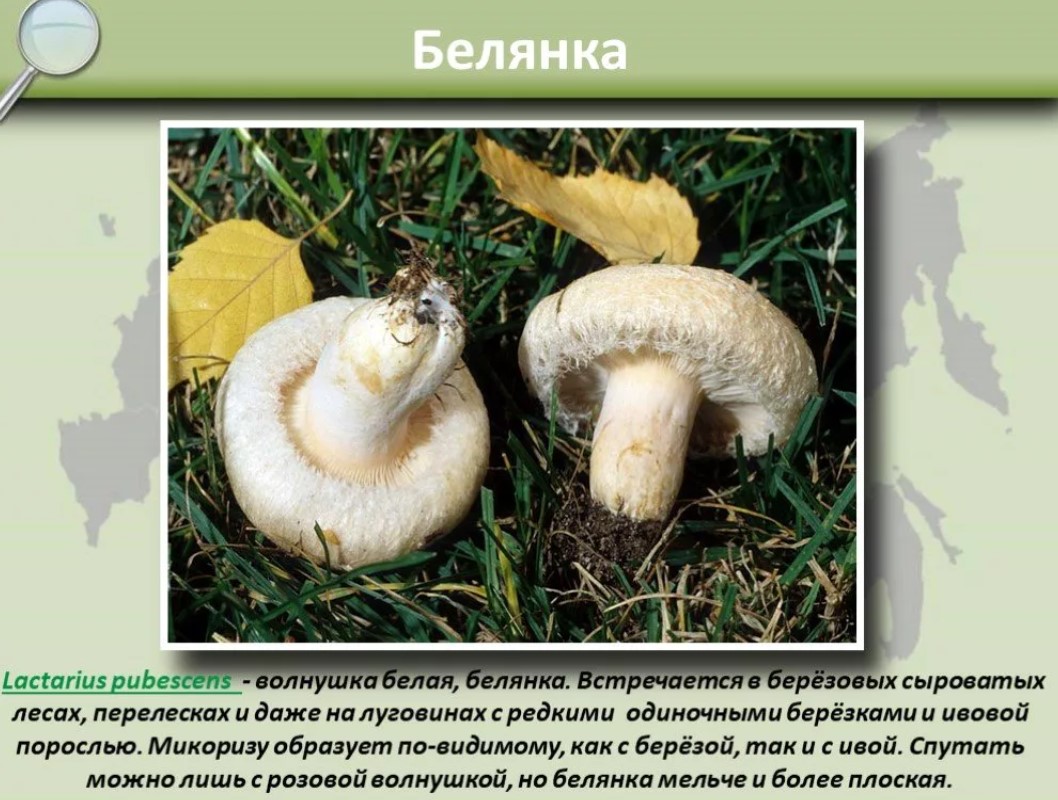 | Диаметърът на шапката е до 26 см, а формата ѝ варира от изпъкнала до фуниевидна. Кожицата е бяла, а повърхността е мъхеста. Цветът може да бъде жълтеникав или червеникаво-кафяв с охра петна. | Условно годни за консумация, използват се за храна след накисване | Расте в иглолистни и широколистни гори, периодът на плододаване продължава от средата на юли до септември. | Цветът на шапката варира; хрилете имат зеленикав или жълтеникав оттенък. |