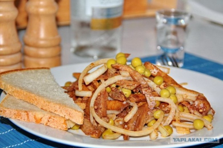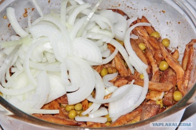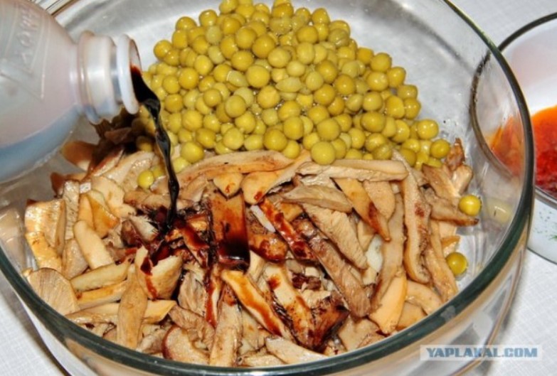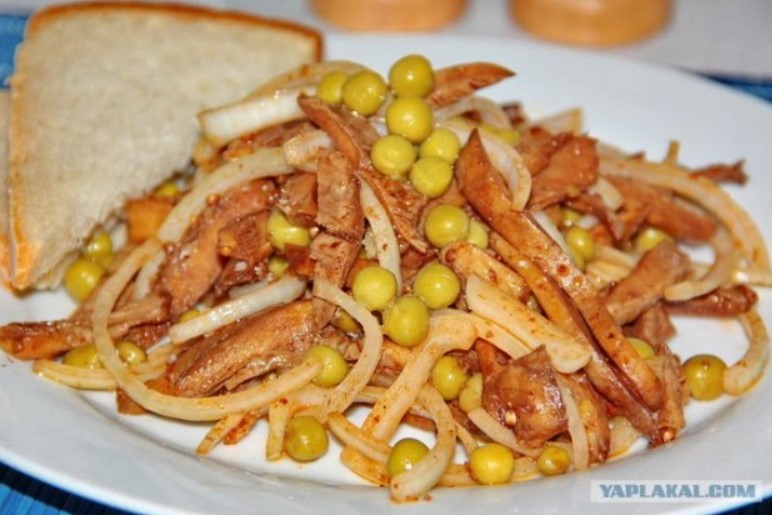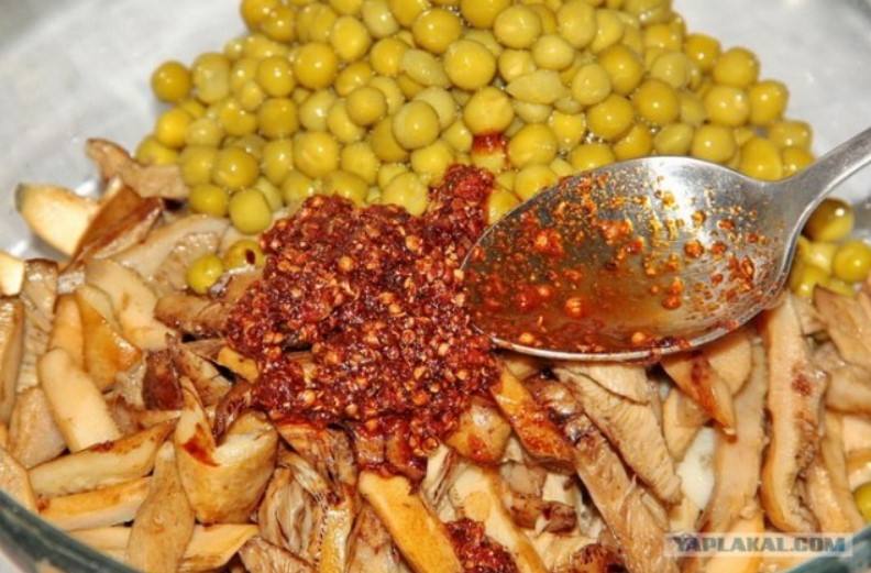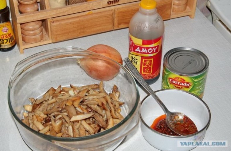 Наскоро забелязах, че зеленият грах се съчетава добре с гъби. И никой не би оспорил вкуса на пресен лук в гъбите... А за „азиатски щрих“ добавих супена лъжица паста от люти чушки и смлян кориандър, и, разбира се, соев сос...