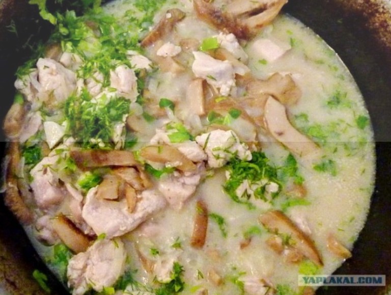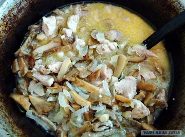 Разбъркайте и запържете за още една минута. След това добавете гъбите и лука отгоре.Добавете вода, заквасена сметана и лимонов сок, добавете сол, оставете да заври, намалете котлона на слаб огън и покрийте с капак. Оставете да къкри още 30 минути.