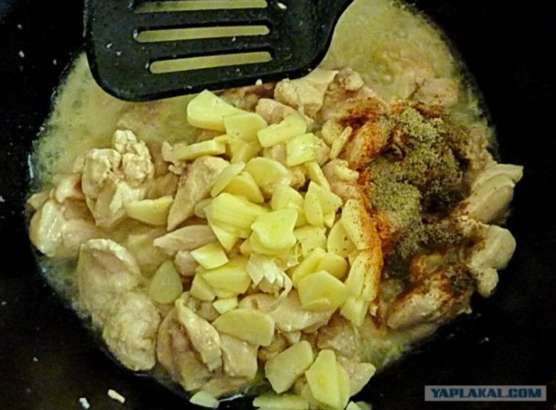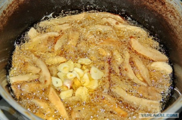 Отстранете колкото е възможно повече месо от пилето, отстранете кожата и го нарежете на парчета. Сложете останалото месо в тигана; можете да използвате остатъците, за да направите бульон за супа (е, това е за друг епизод).Сложете месото в казан със загрято олио и го запържете, докато стане бяло и сочно (не е задължително да стане хрупкаво, тъй като все още къкри). След като по-голямата част от влагата се изпари, добавете нарязан (или смлян/счукан, което предпочитате) чесън и черен пипер.