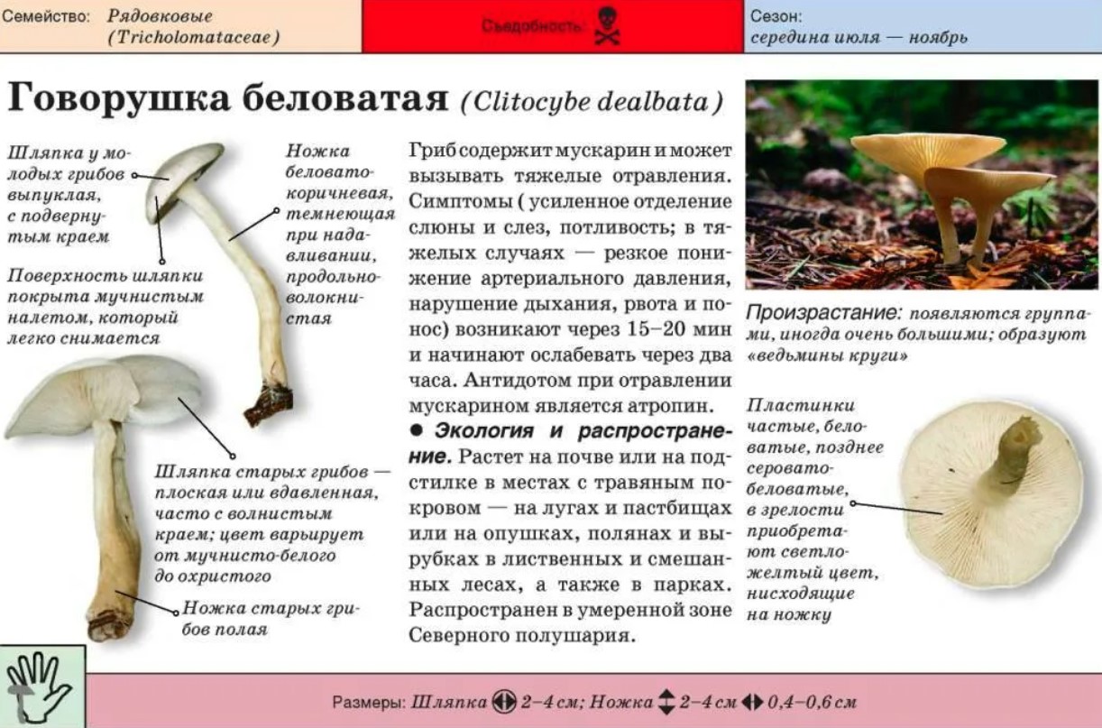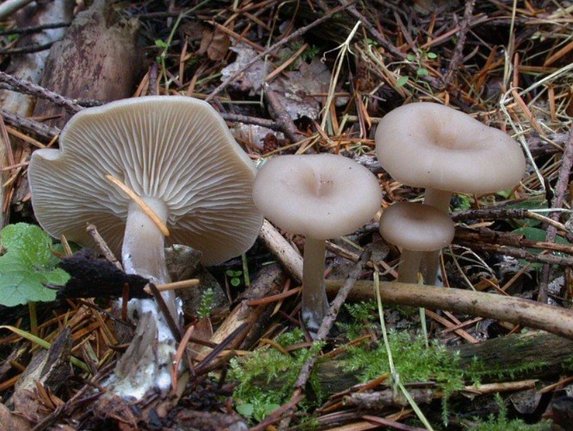 | Говорител белезникав, белезникав | Гъба с шапково-стъблена форма, пластинчаста, без воал. Шапката е с диаметър 1-4 см и първоначално е плоска. По-късно в центъра се появява малка вдлъбнатина. Цветът варира от светлосив до бледочервен. Месото е воднисто, има остра миризма и горчив вкус. Пръчката достига 2-4 см дължина и е подобна на цвета на шапката, с гладка повърхност. | Неядлива, гъбата съдържа опасен алкалоид - мускарин. | Предимно смесени и широколистни гори, изключително рядко срещани в иглолистните гори. |