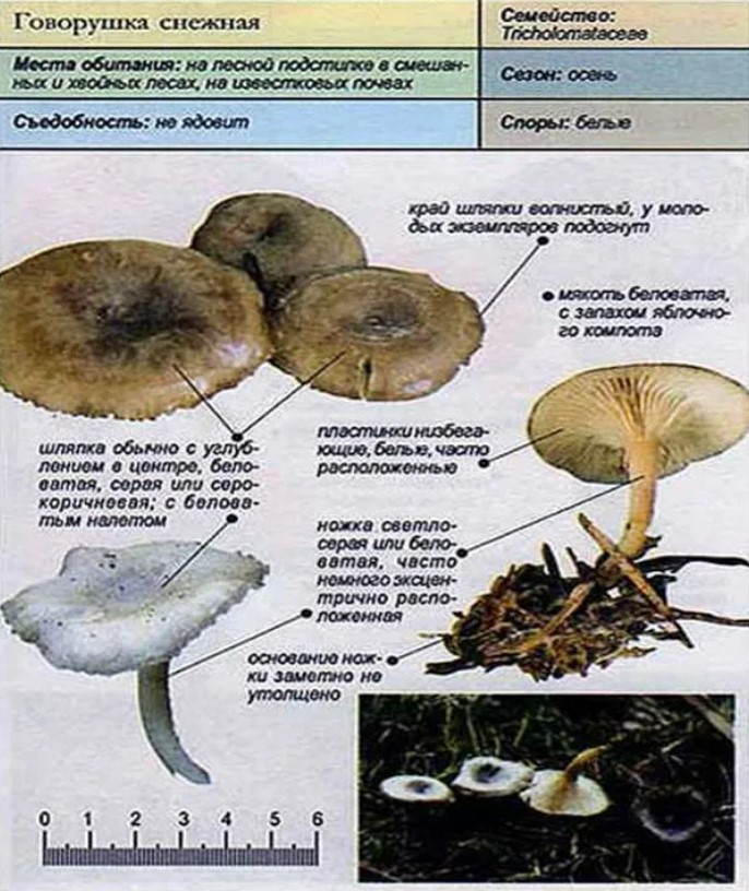 | Снежен говорител | Шапката е с диаметър 4 см, сиво-кафява на цвят и леко вдлъбната. Покрита е с бял налеп. Стъблото е с диаметър до 0,4 см и дължина около 4 см, кремаво или червеникаво на цвят. | Ядливо. | Появява се още през май, предпочита иглолистни гори и расте в кръгове или дори редове. |