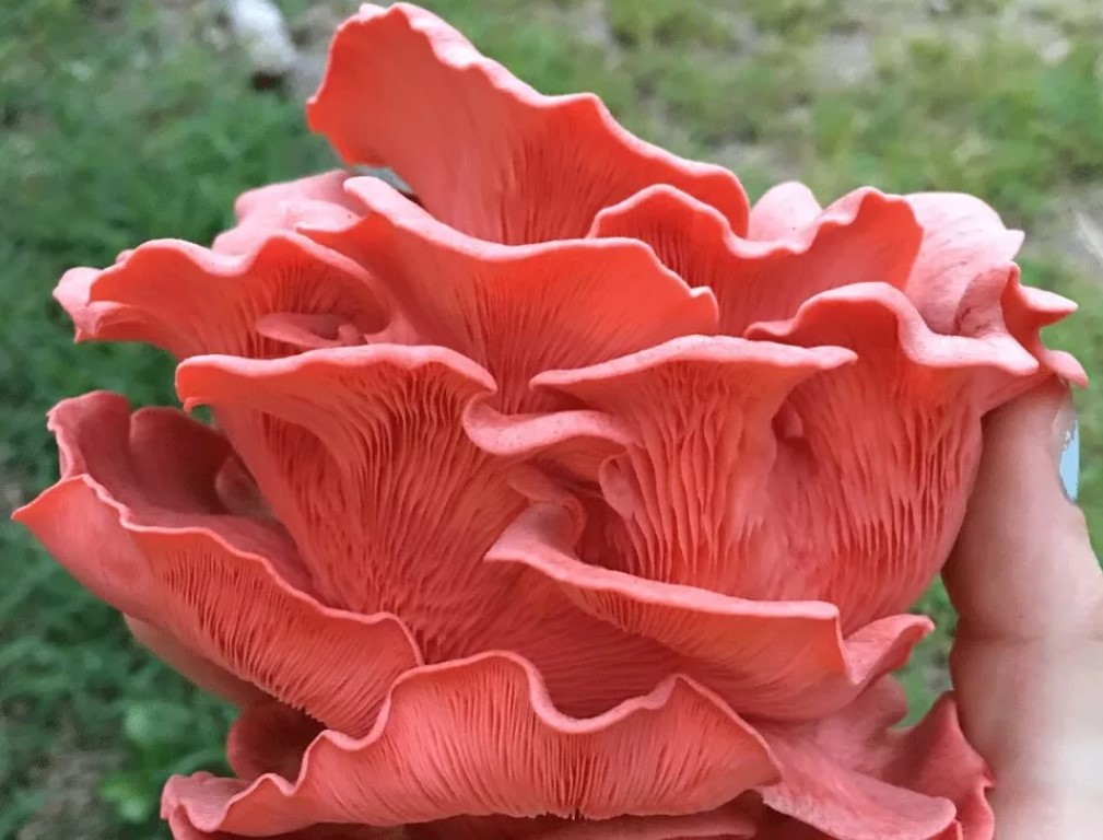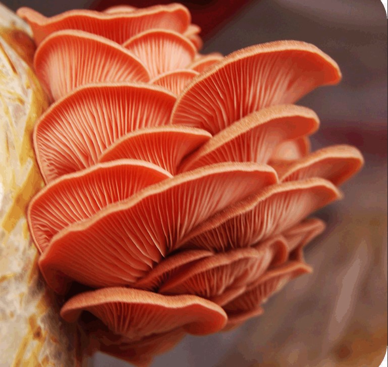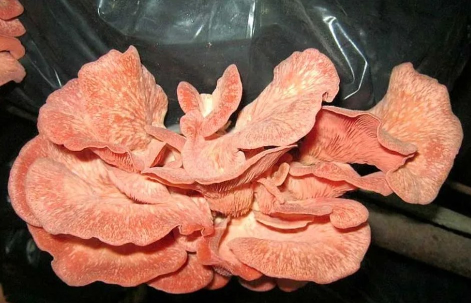 - Розово (Pleurotus djamor)Гъбата расте много бързо, като първата реколта се появява 10 дни след засяването на мицела. Шапката се отличава с розовия си цвят и вълнообразния си ръб. Предпочита високи температури, от 16 до 30 градуса по Целзий.