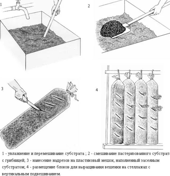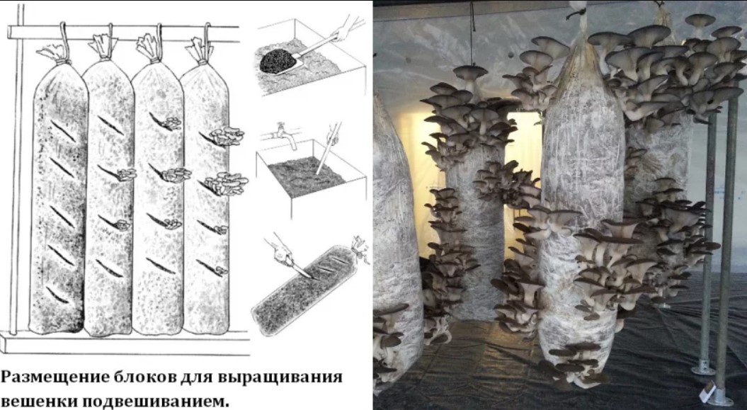 - ИнтензивенПо-скъп, но продуктивен метод за отглеждане на кладници. Изисква субстрат, направен от широколистни дървени стърготини, пшенична слама и остатъци от царевица. Този субстрат се дезинфекцира чрез варене във вода, пресоване под тежест и смесване с мицел (30 г на 1 кг субстрат). Приготвената смес се поставя в торби за отглеждане. В торбите се правят разрези с дължина до 2 см в шахматна дъска на интервали от 15 см. След това торбите се поставят върху картон или се окачват в напълно дезинфекцирано помещение. Те трябва да имат достъп до въздух и светлина (по време на плододаване). По време на инкубационния период помещението трябва да се дезинфекцира ежедневно с дезинфектанти, за да се предотврати загиването на спорите. Първата реколта се събира след 1,5 месеца. Втората реколта се получава след 3 седмици и този процес се повтаря четири пъти подред.