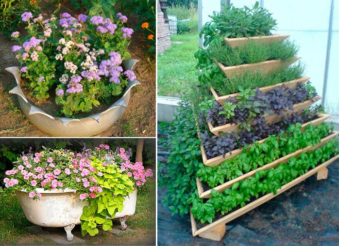 Градинското легло ще бъде уникално, ако използвате нежелани предмети. Огледайте се в бараката за нещо. Цветята, растящи в стара лодка, изглеждат като уникално дизайнерско произведение. Зеленчуците могат да се засадят директно на масата, като се запълнят дупките в плота с пръст. Напълнете стара вана с пръст, за да създадете още едно уникално градинско легло.