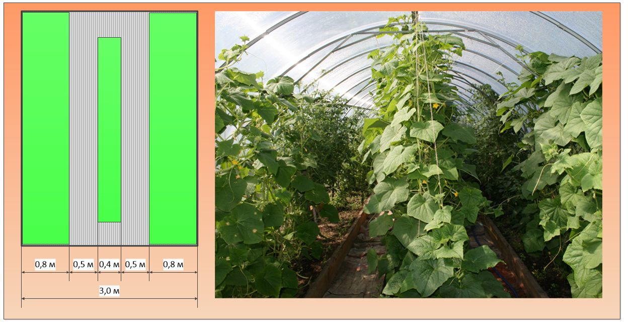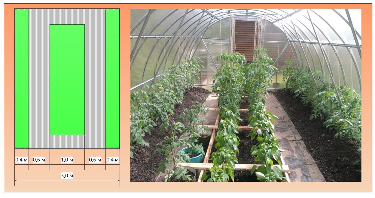 За оранжерия с такъв размер и за високи култури е за предпочитане да се засадят три реда. Това ще позволи ефективно използване на пространството и ще осигури движение.