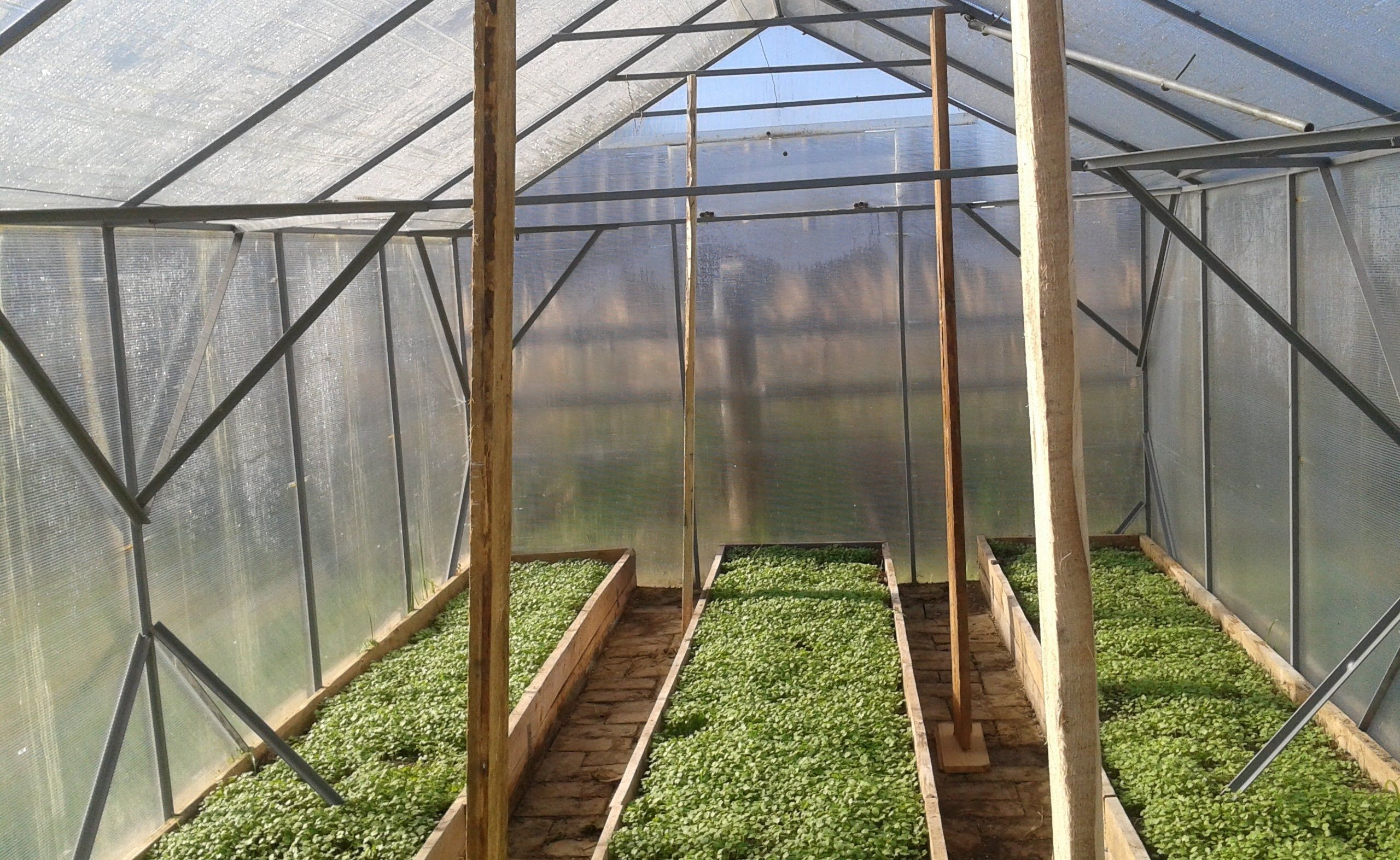 - по стените по дългата част на оранжерията има 2 широки легла;