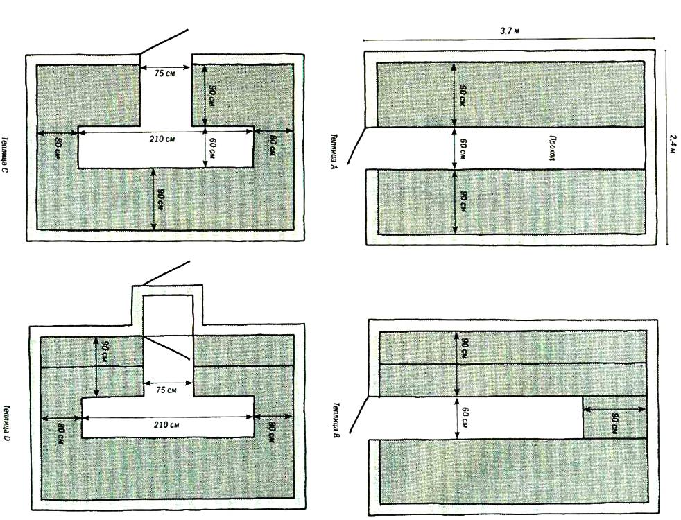 В оранжерия с размери 2,4 м на 4 м, лехите могат да бъдат разположени само на два реда, всеки с ширина 0,9 м. Те могат да поберат два реда домати, чушки и патладжан. Краставиците обаче е най-добре да се засаждат на един ред. Ширината на пътеката в този случай е 0,6 м, което позволява лесен достъп с количка.