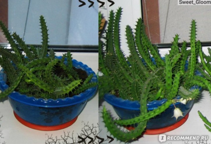 Хуернията е благодарно и непретенциозно растение. Снимката по-горе показва същия храст в продължение на шест месеца. На снимката вляво току-що е пресадено в нова саксия. На снимката вдясно вече е пуснало корени в дома си и цъфти в пълен разцвет.