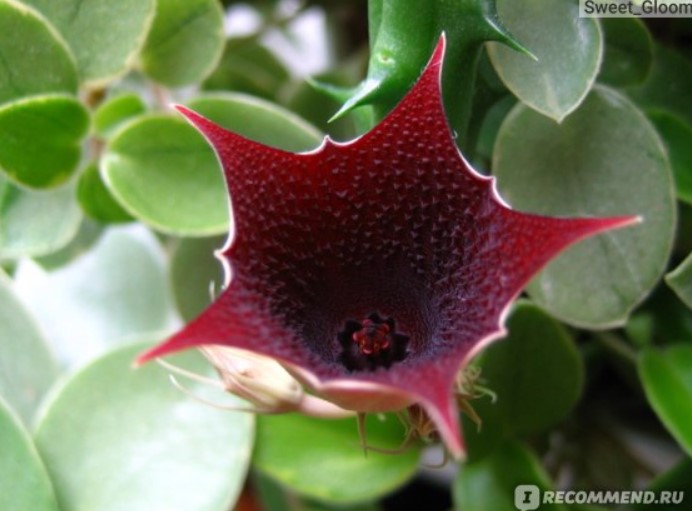 Имам това растение от много години. То е едно от любимите ми. Нискорастящо е, с месести стъбла и интересни цветове. Принадлежи към същото семейство като стапелията-ластовнева (род Трепетлика). Много издръжливо и непретенциозно растение е. Разбира се добре с други растения при подобни условия на отглеждане. Отглеждам го в една саксия с алено алое или като почвопокривно. Цъфти редовно с тъмночервени, петлъчеви цветове с размер около 2 см, твърди на допир. Цветовете имат много слаб, неприятен аромат, но се усеща само ако пъхнете носа си в цветето. Основната опасност е преполиването, така че поливайте от време на време; пулверизиране не е необходимо. Расте добре на прозорец с източно изложение. Размножава се чрез резници. Препоръчвам ви да разгледате това растение в цветарските магазини.