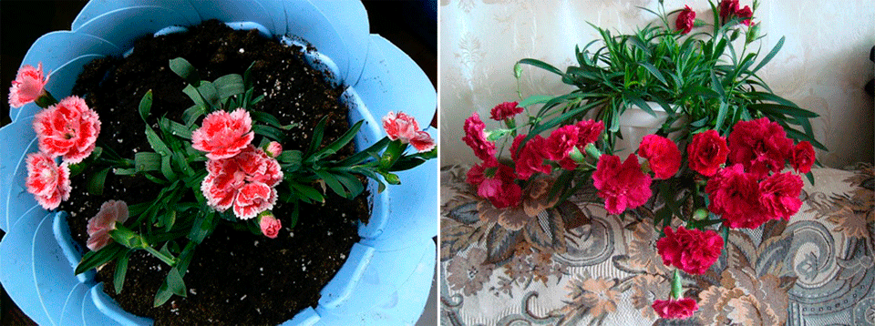 Грижата за карамфили, отглеждани на закрито, е много по-лесна от грижата за растения, отглеждани на открито. Абсолютният минимум е редовно разрохкване на почвата, торене и резитба.