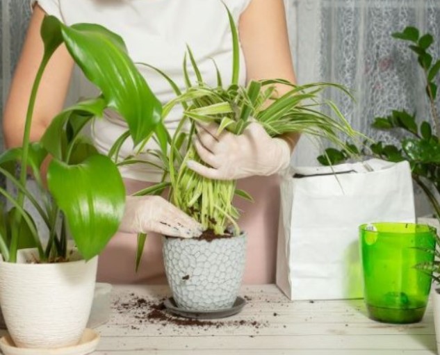 Хлорофитумът има мощна коренова система, която расте бързо. Затова се препоръчва да се пресажда всяка пролет през първите няколко години. Възрастните растения трябва да се пресаждат на всеки 3-4 години, когато корените се натрупат. Това може да се определи от по-бавен растеж, продължителна липса на цъфтеж или корени, растящи през дренажните отвори.