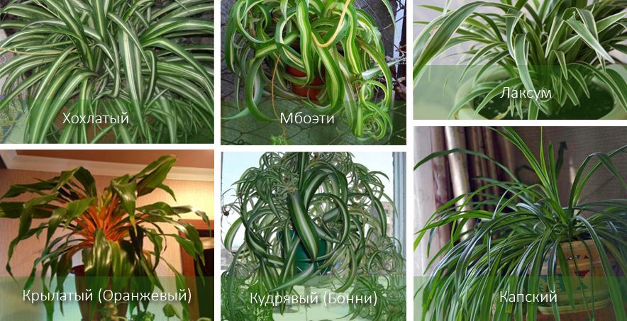 Само няколко вида хлорофитум се отглеждат за декоративни цели. Въпреки това, селекционерите са разработили много хибридни сортове, базирани на тях, които се различават по цвета и формата на листата.