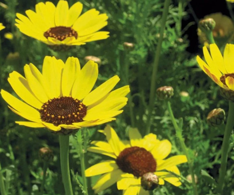 Сортът е идеален за декориране на цветни лехи, бордюри и миксбордери. | 70-80 мм, с ярко жълти венчелистчета и тъмнокафяв център, единични | |