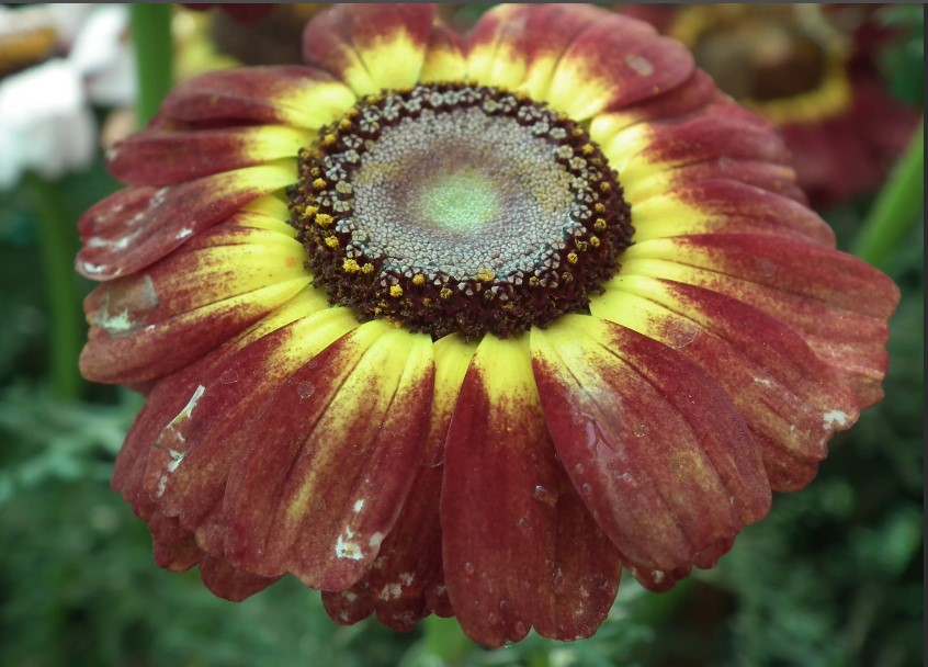 Расте от 20 до 70 см височина. Стъблото е плътно, а листата са разделени на две части с дръжки. Съцветията са кошничковидни и могат да бъдат двойни, полудвойни или единични, с диаметър от 50 до 70 мм. Тази хризантема образува двуцветни цветове: тръбестите са тъмночервени, а езичестите са бели или жълти с бледочервен кант.