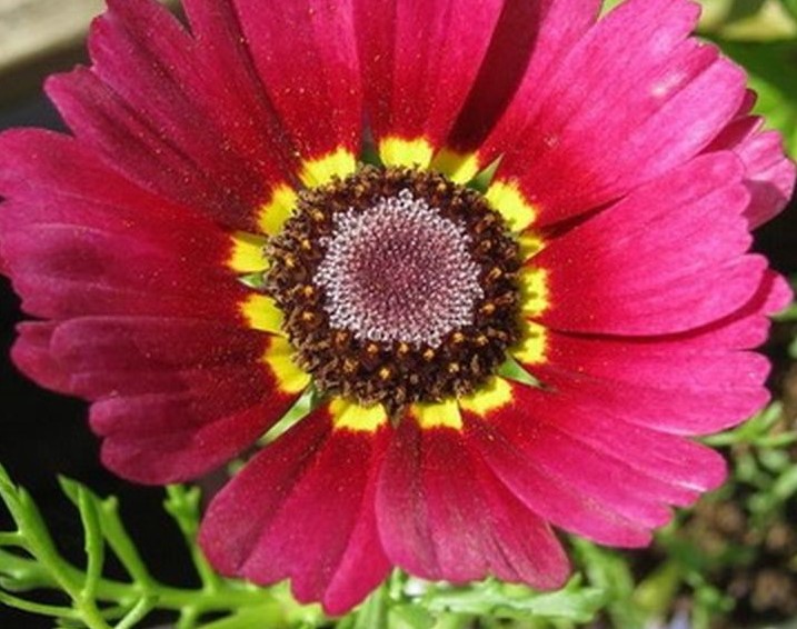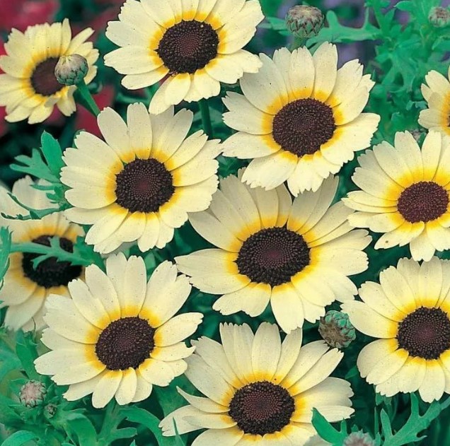 Едногодишен сорт, който цъфти в началото на юни. | До 60 мм, със снежнобели кошнички и пръстени от жълт, червен и кафяв цвят, прости | |