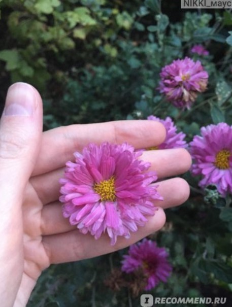 Храсти със средно голяма листа, до 80 см височина. | 90 мм, розово-лилаво, недвойно. | Началото на октомври. | Високо. |