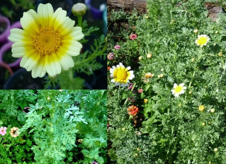 Издънките, листата и пъпките са годни за консумация и имат вкус, подобен на целина или любич. Листата се използват в месни ястия и салати. Младите листа се използват за гарниране на ястия и се добавят към супи и омлети. Те също се задушават и пържат пресни. Съцветията се използват в сладкарството. Използват се и за приготвяне на маринати и туршии. Тъй като венчелистчетата имат горчив вкус, първо се накисват в оцет или захарен сироп. Изсушените съцветия се запарват за приготвяне на чай. Хризантемата се използва за приготвяне на настойки за лечение на мигрена и стимулиране на апетита. Тя също така има лек слабителен ефект и подобрява сърдечно-съдовото здраве. Благодарение на високото си съдържание на естествени антиоксиданти, растението предпазва организма от негативни фактори на околната среда и укрепва имунната система. Напитките от хризантема са отлични за тонизиране и енергизиране. |