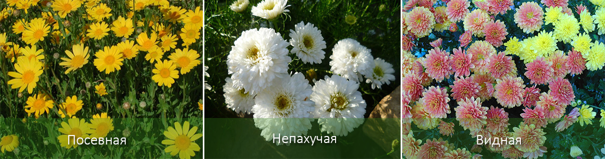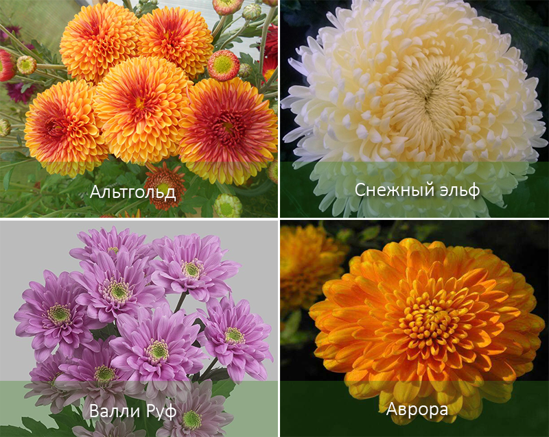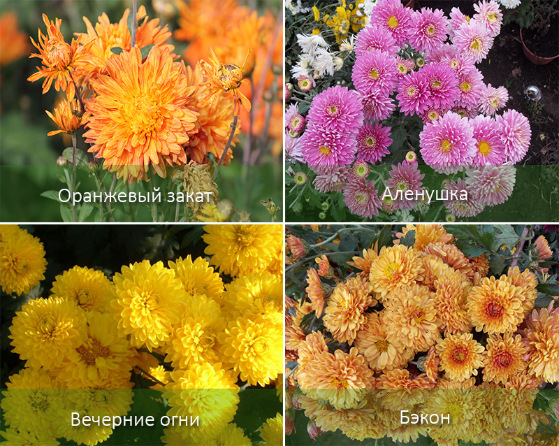 | индийски | Височината на храстите достига 1,5 м. Съцветията цъфтят през есента. | Алтголд | Помпон, двоен, с тъмно жълти венчелистчета. |