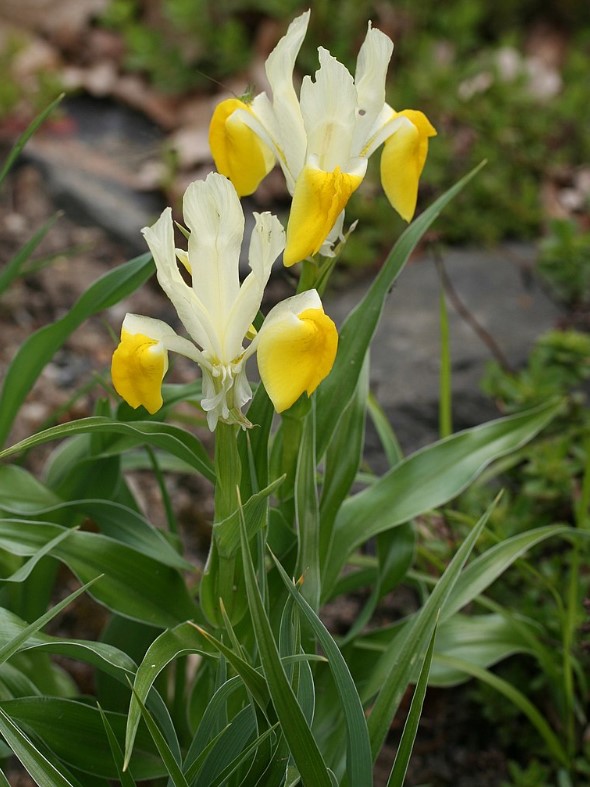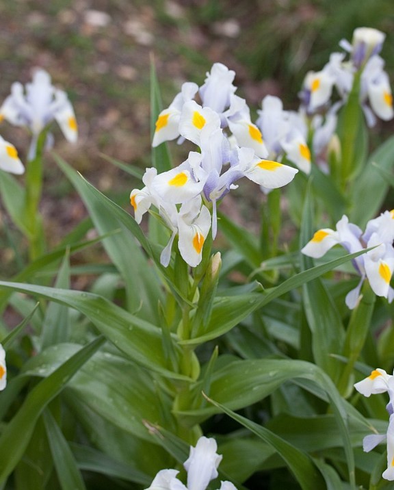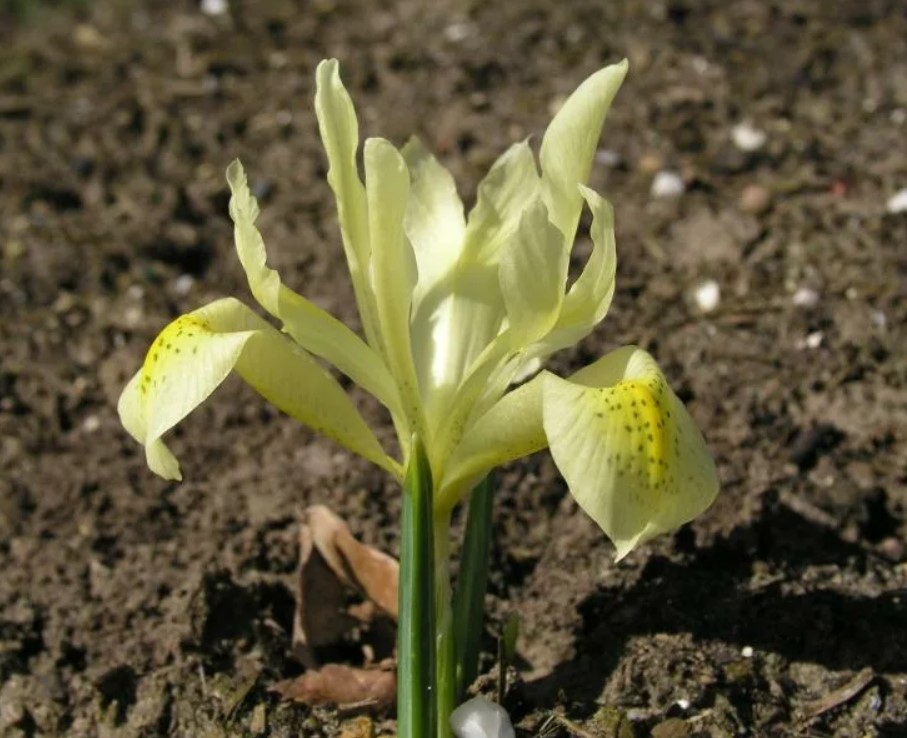 Ирисът расте 20-40 см. Цветовете са бели или кремаво бели с жълти връхчета. Цъфти през април-май.
