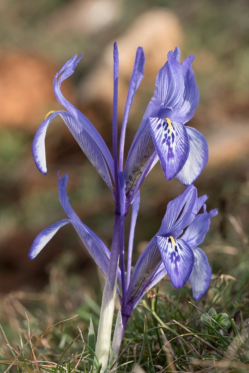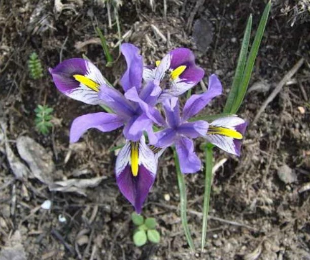 Луковичен ирис, 10-15 см. Цветовете са тъмно или бледо виолетови, червено-лилави, сини и бели. Това цвете е вписано в Червената книга.