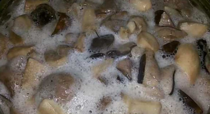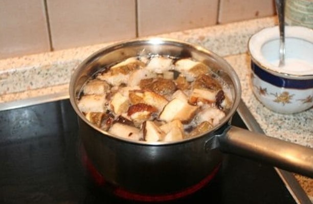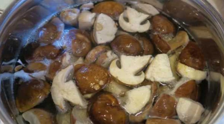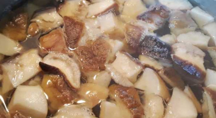 - Налейте 2,5 литра вода в тенджера, добавете нарязаните гъби и гответе 15 минути, като отстранявате пяната.