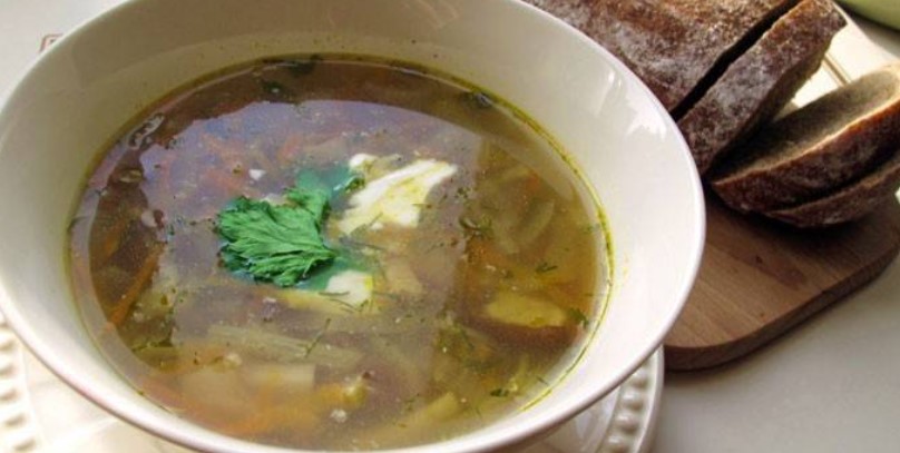 - Нарежете киселеца, сложете го в тенджера, добавете пържените зеленчуци и гответе още 2 минути след като заври.