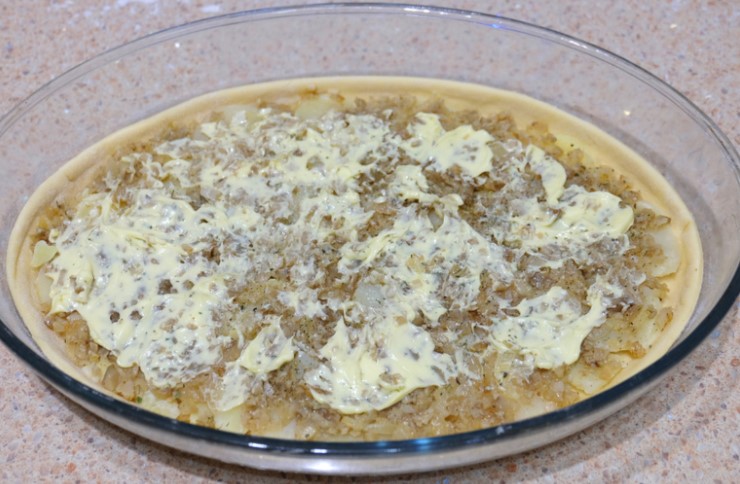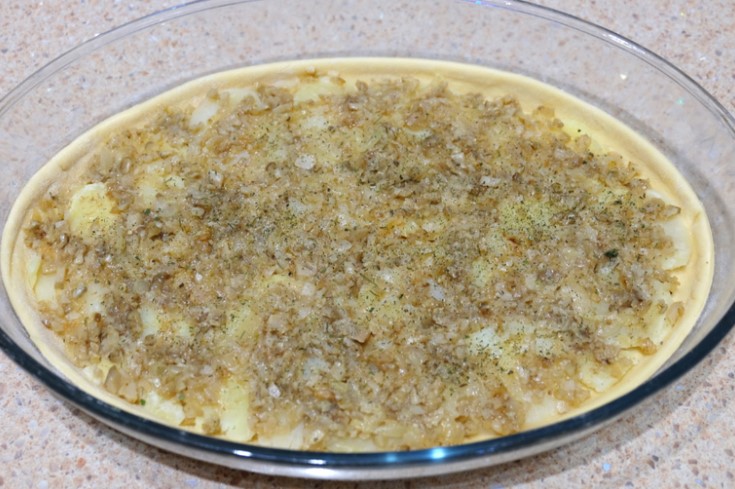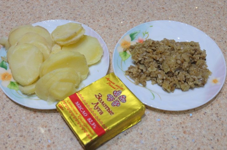 Сварете картофите в подсолена вода и ги нарежете на филийки. Плънката за пай е готова.