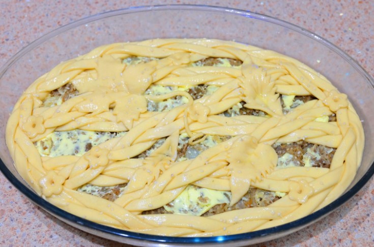 Украсете пая по ваш вкус. Намажете пая с разбито яйце и поръсете със сусамови семена. Сложете във фурната да се пече. Печете до златисто кафяво и готовност.Добър апетит!