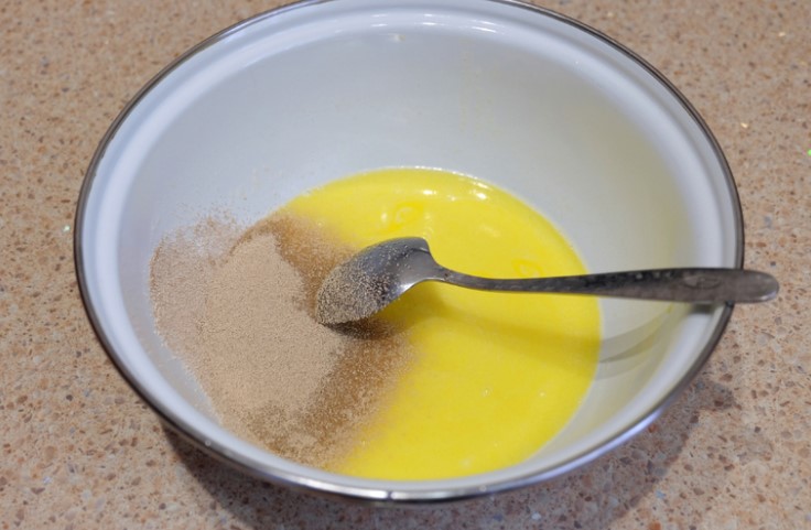 Разтопете маслото. Добавете млякото и захарта. Сместа трябва да е топла, но не гореща. Добавете маята.