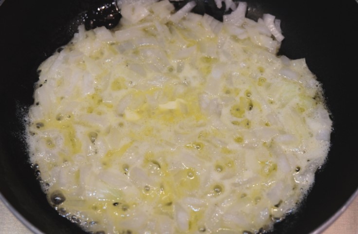 Омесете тестото. Покрийте тестото с кърпа или хавлиена кърпа и го поставете на топло място да втаса. След като тестото втаса за първи път, което ще отнеме около 1 час и 1,5 минути, го оформете с плочка и го върнете във фурната за второ втасане. Докато тестото втаса, пригответе плънката.Нарежете лука на ситно и го запържете в маслото до светло златисто кафяво.