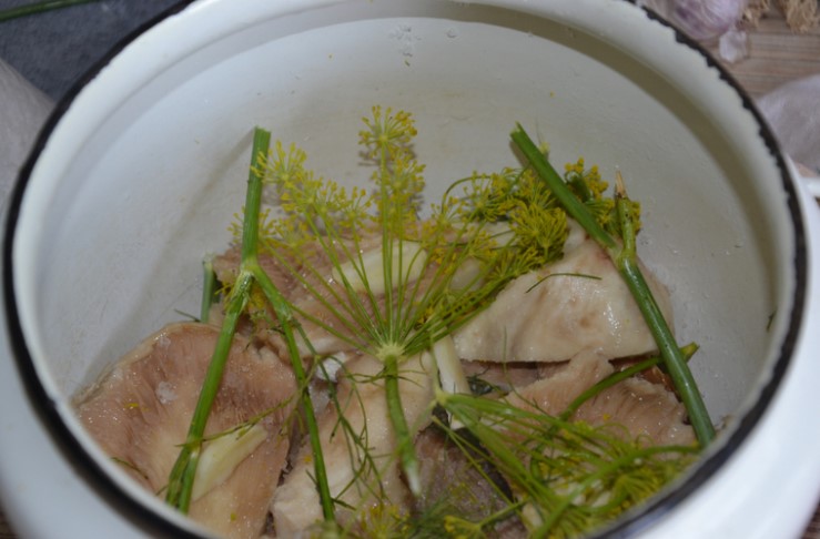- Пригответе саламурата в отделен съд. Добавете сол и подправки към врящата вода. Варете 5 минути. Добавете копър. Прецедете гъбите през гевгир.