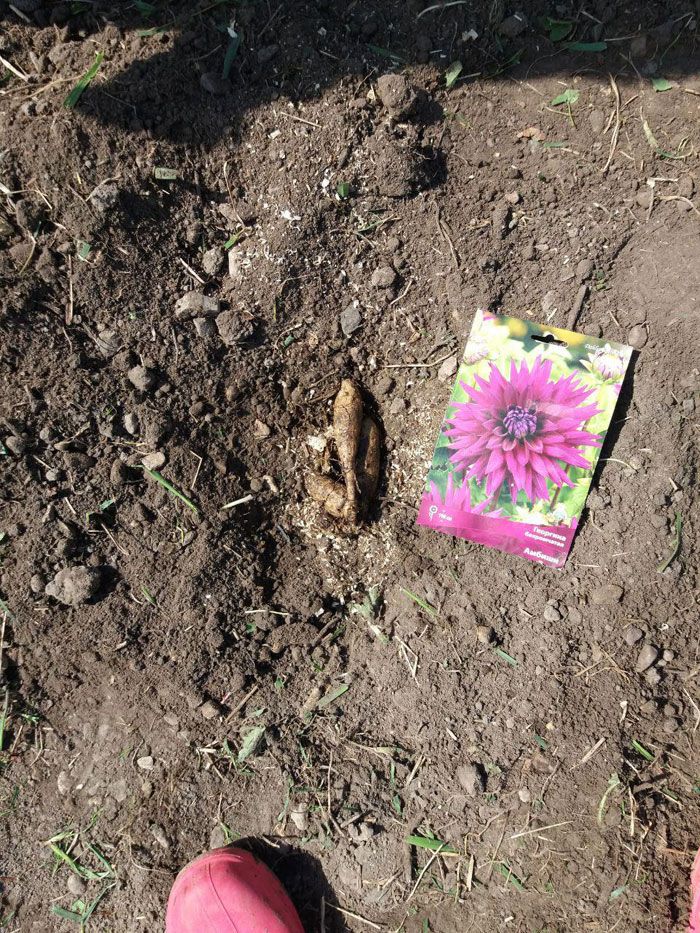 - Поставих далиите отгоре, разпервайки грудките им. Под кореновата шийка не трябва да има празнини, а над нея трябва да има около 2 см почва. Имайки това предвид, покрих далиите с почва.