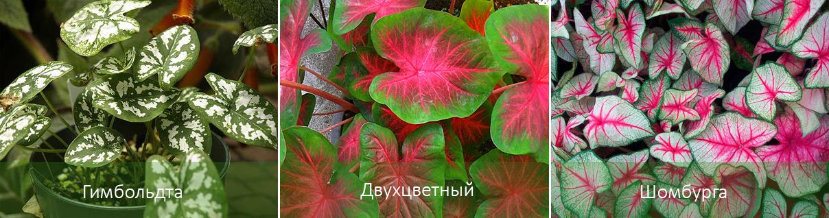 Известни са 15 вида каладиум, отглеждани за декоративни цели. Най-популярни са гумболдти, биколор и шомбурги.