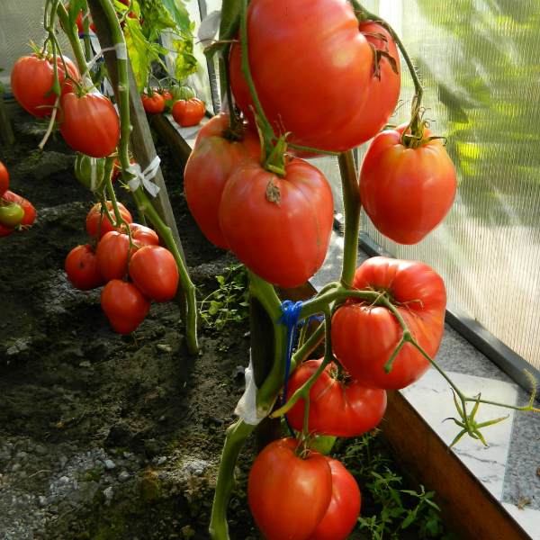 Среднозреещ индетерминантен сорт за оранжерии. Изисква подвързване и формиране на единични или двойни стъбла. Подходящ за салати и преработка в доматени продукти. | Кръгло-сърцевидни, оребрени, розово-червени, 150-250 г. Отличен вкус. |