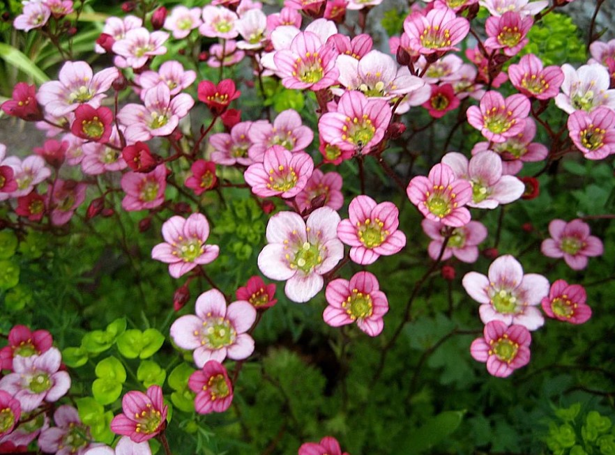 Различните сортове цъфтят в нюанси на бяло, розово, червено и жълто. Саксифрагата е много лесна за отглеждане, лесно понася суша и температурни колебания.