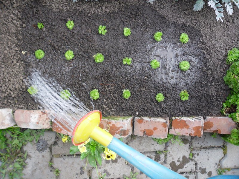 Изкопайте дупки в цветната леха, използвайки схема 20x20, и поставете предварително напоеното растение в дупките заедно с почвената топка. Уплътнете почвата и не поливайте разсада допълнително през следващите 10 дни.