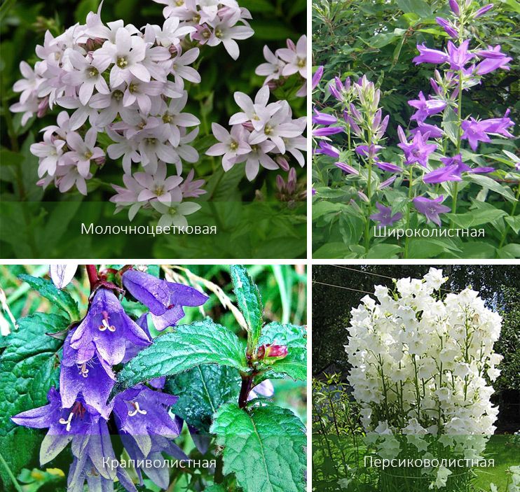 | Прасковенолистна | В открита земя достига 90 см. Цветовете са с диаметър до 3 см. Камбанките са грациозни, бели и сини. Растението е вписано в Червената книга. |