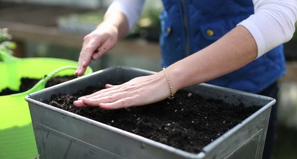 - Запълва се на 2/3 с подготвена почва, след което по повърхността на земята се правят бразди с дълбочина 1 см на разстояние 7-9 см една от друга.