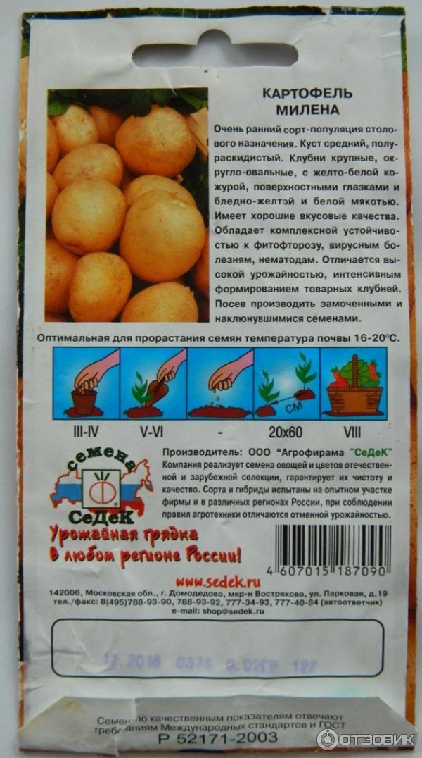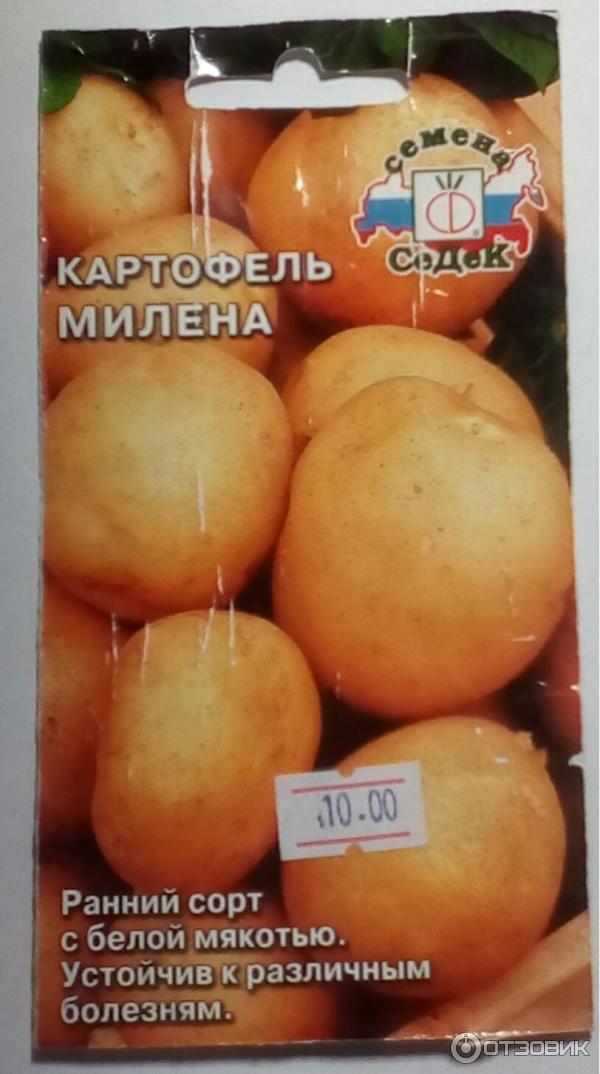 450-600 ц/ха | Средно ранен сорт (70-90 дни). Храстът не е много голям, но разпростиращ се. Картофът е предназначен за трапезна употреба. Грудките са кръгло-овални, кората е жълто-бяла, а месестата част варира от бледожълта до бяла. Има малко очи, разположени на повърхността. Потребителите отбелязват отличния вкус, а градинарите ценят Милена заради устойчивостта ѝ на късна болест, нематоди и вируси. Добивът, както и продаваемостта, са много високи. Преди засаждане семената трябва да бъдат предварително покълнати чрез накисване. Младите картофи могат да бъдат засегнати от листни въшки, трипси, Колорадски бръмбар. | 0,02 г от 13 рубли. |