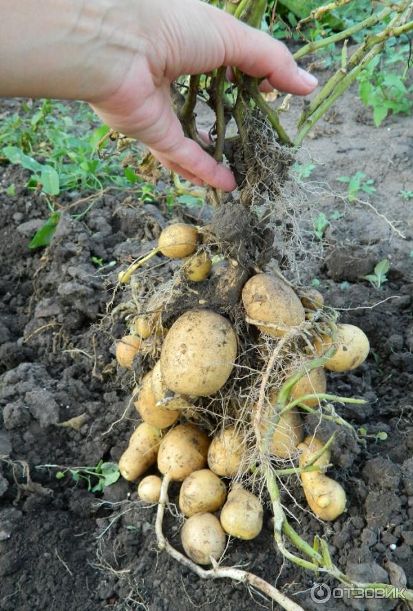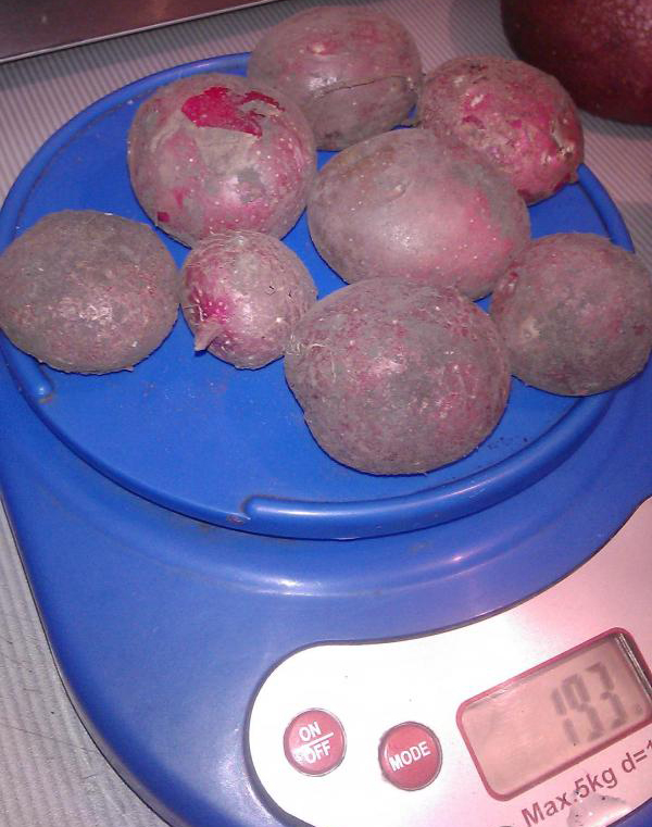 Картофите бяха точно като на снимката на опаковката. Точно толкова кръгли и жълти. А размерите им бяха просто изумителни. От гъше яйце до размера на нокът на нокът. Събрах до 25 грудки от всеки храст, въпреки че не събрах много малките и не ги броих. В крайна сметка успях да получа половин кофа картофи за семе от едно пакетче семена за 10 рубли.