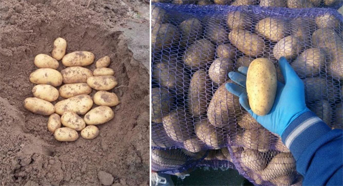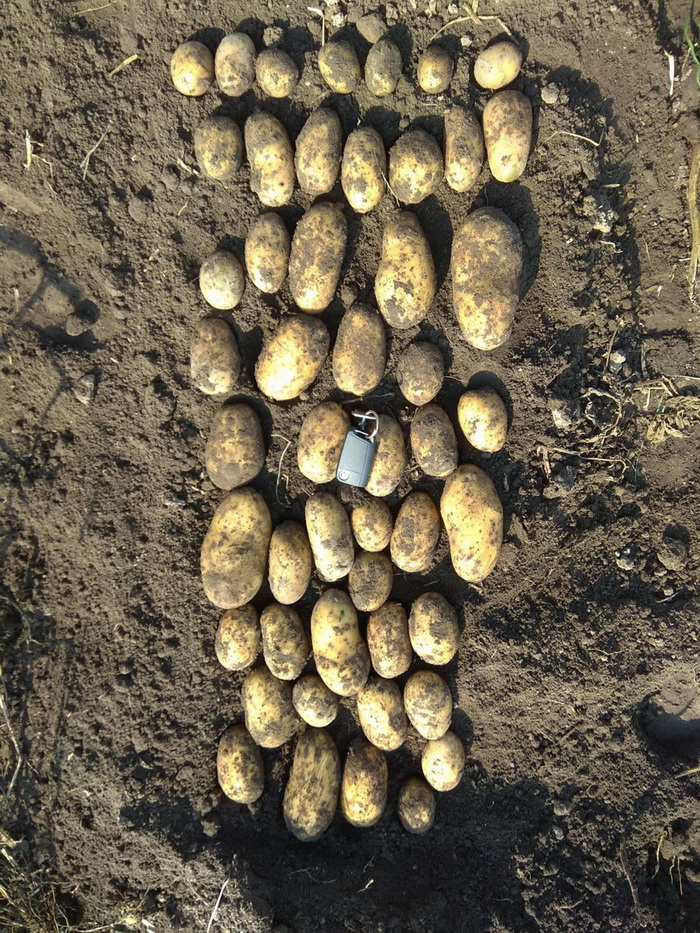 Засаждането през 2017 г. даде добра реколта, с любимата ми овална форма. Не мога да кажа, че беше отлична, тъй като имаше само няколко грудки на храст, но вкусът беше отличен - кремообразен, деликатен и нишестен. Трябва да се отбележи, че почвата на открито е бедна, песъчлива и суха.