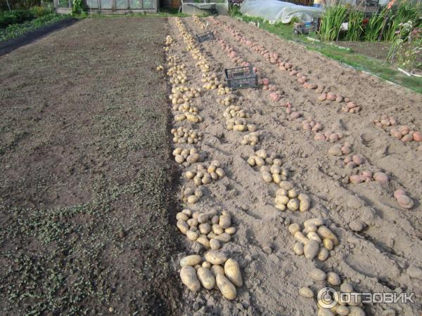 Миналата есен, след като събра картофите, собственикът изора парцела с мотоблок. След това посее горчица и овес. Тази пролет разпръсна доломит и картофено торене върху парцела. След това отново изора парцела. Картофите се засаждат на редове в дупки, изкопани с лопата. Във всяка дупка се добавят пепел и хумус. Преди засаждането, семенните картофи се оставят да покълнат добре. Грудките се напръскват със специален препарат, мисля, че беше Командор, за защита от колорадски бръмбари. Преди да се постави грудката в дупката, тя се полива. Нашата почва е песъчлива, така че по време на засаждането вече е била суха. Дупката се покрива с пръст от дупката на следващия ред. Това е, картофите са засадени. Веднага щом се появят кълнове, съседът разрохква пространството между редовете с мотоблок. След това, докато картофите растат, прави две високи окопавания с мотоблок. Преди картофите да цъфтят, започва да ги полива. Тази година имаше достатъчно дъжд, така че ги поле само веднъж. В началото на юли ги напръска за първи път с Profit Gold срещу късна мана, а след това още два пъти. Последното пръскане беше с бордолезов разтвор. През лятото подхрани растенията с течен билков тор. Върховете бяха високи колкото човек. Чудеха се дали цялата реколта е изчезнала във върховете. Две седмици преди прибирането на реколтата съсед отряза върховете. И ето какво се случи. Вега е светъл картоф, червеният е от сорта Ирбитски.