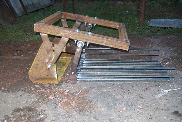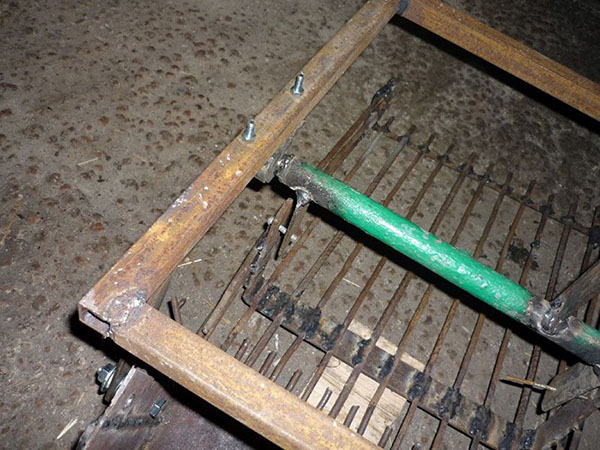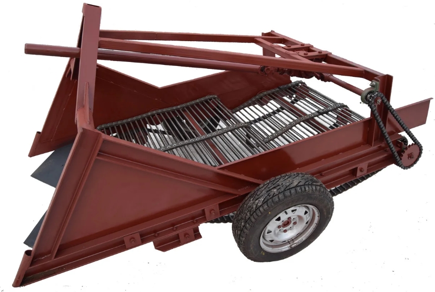 Конвейерът може да бъде направен от метални пръти. Арматура, нарязана на парчета, също ще свърши работа. Прътите се монтират във верига или подвижен джант, успоредно един на друг. Конвейерът се задвижва от скоростна кутия от мини трактор, използвайки верижна или зъбна предавка.