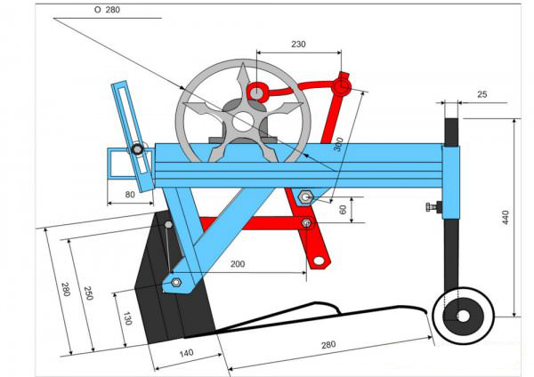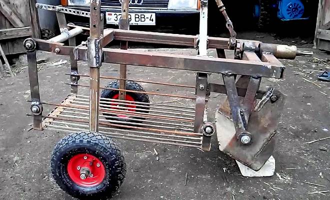 Двойна рамка (460 x 460 мм, височина 60 мм) е изработена от метален профил с помощта на поялник. От едната страна са закрепени опорни стълбове (440 мм, профил 25-ти калибър), а от другата - канал. Към стълбовете е заварена ос с колела Wagner. Към останалите две страни са заварени метални ленти, които да задържат лемежа. Тя е изработена от метал (трикомпонентна конструкция) и ще повдига почвения слой. За целта металният материал се сгъва до необходимите размери (390 мм ширина, 280 мм височина, 140 мм ширина, стесняваща се към долната част), като гънките трябва да бъдат заварени за сигурност. Закрепва се към лентите с помощта на безшумни блокове. Разстоянието от основната ос на въртене до теглителния прът е 60 мм. Самият лемеж трябва да бъде допълнен с телени пръти с форма на осморка. За да се направи конструкцията по-надеждна, по целия периметър е заварена метална лента, изработена от трикомпонентна метална плоча. Към нея ще бъдат закрепени пръти с дължина 350 мм. Режещ ръб, изработен от здрава стомана, трябва да бъде занитен от обратната страна и добре заточен. След това към лемежа се заваряват регулиращи пръти (на височина 250 мм), които ще го свържат с ексцентрика (300 мм задвижваща скоба, 230 мм задвижваща щанга, 25 мм ексцентрик). След това боядисайте конструкцията. За безопасност всички движещи се части трябва да бъдат боядисани в червено.