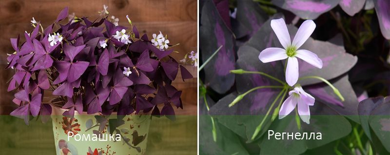 | Регнела (триъгълна пеперуда) | 3-делна, наситено зелена листа. | Малка, бяла. | Лесно за отглеждане растение, може да издържи около 10 дни без поливане. Препоръчва се редовно прищипване на листата, за да се поддържа растението гъсто. |