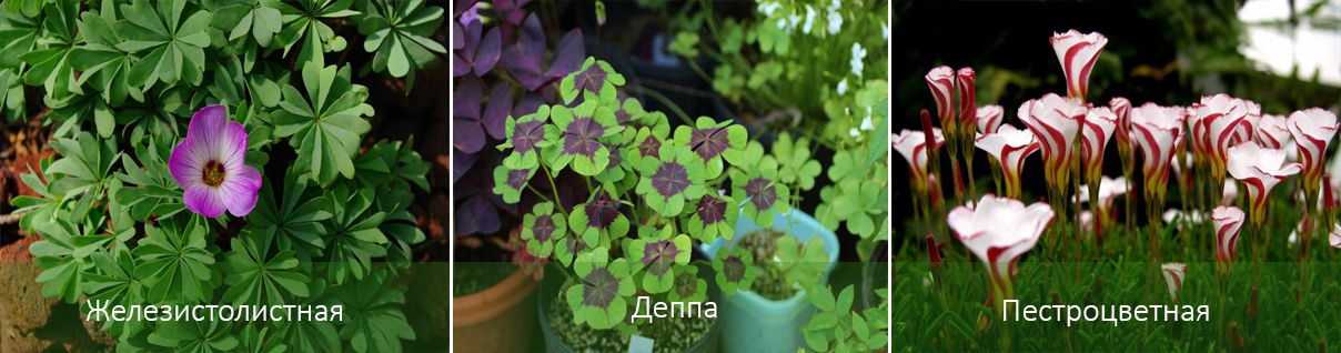 | Триъгълен | Дланевидно разположените трилистни листа увисват и се издигат в зависимост от времето на деня (трептенето на листата наподобява пляскане на криле на пеперуда). Цветът е тъмнолилав. | Малка, лилава. | Не изисква много поддръжка и няма период на покой. Избягвайте изсъхване или преовлажняване на почвата. За да стимулирате растежа, осигурете принудително зимуване през есента и зимата. Това се постига чрез намаляване на честотата на поливане, подрязване на стъблата и преместване на растението в хладно помещение. |